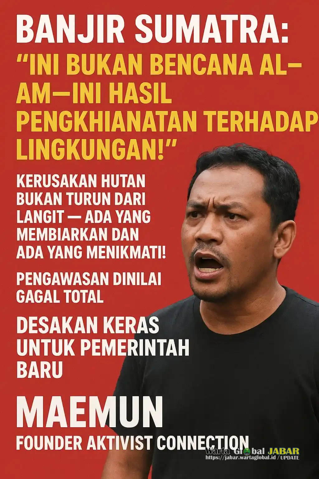 Maemun, Founder Aktivist Connection, menegaskan bahwa bencana ini bukan sekadar akibat cuaca ekstrem, melainkan akumulasi panjang kerusakan lingkungan yang selama ini dibiarkan.