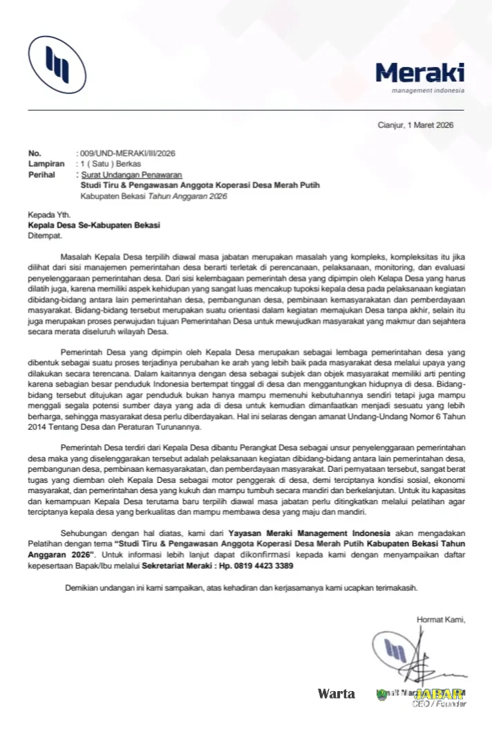 BEKASI, WartaGlobal.id – Di tengah kebijakan efisiensi anggaran yang gencar dikampanyekan pemerintah pusat, Yayasan Meraki Management Indonesia justru melayangkan surat undangan penawaran kegiatan yang memicu kontroversi. Kegiatan bertajuk “Studi Tour & Pengawasan Anggota Koperasi Desa Merah Putih Kabupaten Bekasi Tahun Anggaran 2026” tersebut diduga kuat hanyalah kedok untuk menghabiskan anggaran desa dengan balutan jalan-jalan.