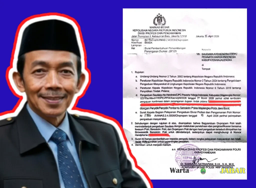 MAJALENGKA - Dengan keluarnya Surat Pemberitahuan Perkembangan Penanganan Dumas (SP3D) dari Mabes Polri Divpropam Nomor: B/1463-b/IV/WAS.2.4/2026/Divpropam merespon surat DPC PPWI Kabupaten Majalengka bahwa Bagyanduan Divpropam Polri telah menindaklanjuti pengaduan dengan melakukan penelaahan dan pengklasifikasian dengan itwasum Polri, Bareskrim Polri dan Divpropam Polri dengan hasil pengaduan tersebut dilimpahkan ke Birowassidik Bareskrim Polri untuk ditindak lanjuti.